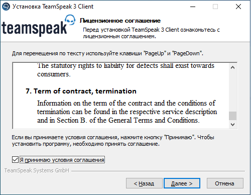 2.2. Соглашаемся с лицензионным соглашением, нажав кнопку "Я принимаю условия соглашения", то есть принимаем соглашение.