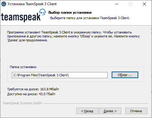 2.4. Выбираем место, куда будет установлена программа. Обычно это "C:\Program Files\TeamSpeak 3 Client". Программа занимает небольшой объем на диске, поэтому можно не менять эту настройку и поставить на диск "С".